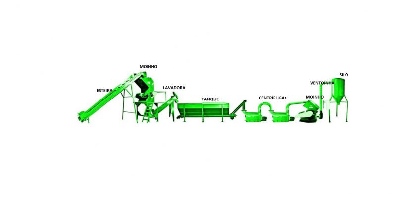 Esteira de Transporte | Moinho Granulador | Lavadora | Tanque de descontaminação | 2 Centrífuga | Moinho | Ventoinha | Silo