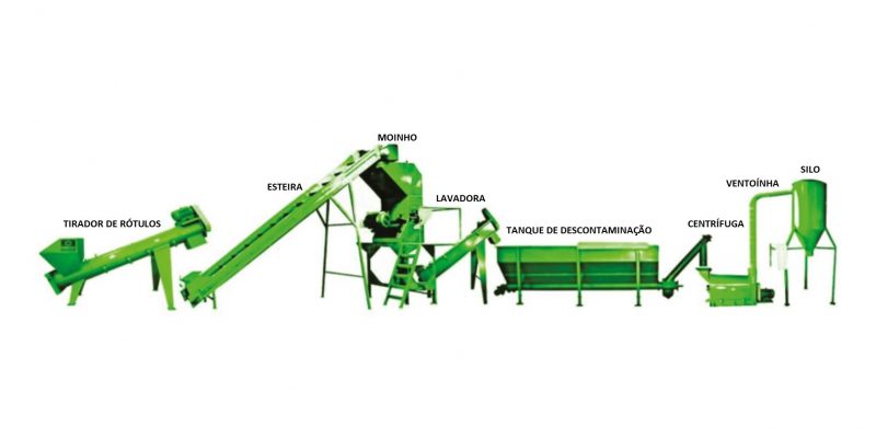 Tirador de Rótulos | Esteira de Transporte | Moinho Granulador | Lavadora | Tanque de descontaminação | Centrífuga | Ventoinha | Silo